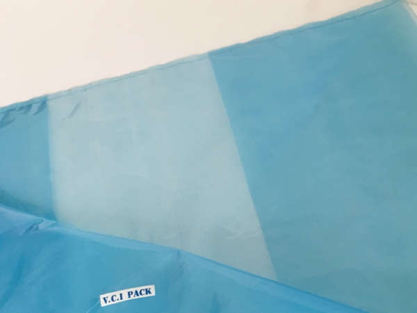 VCI氣相防銹膜(防銹袋)是將高分子聚乙烯樹脂(LDPE)與功能VCI樹脂配比混合,采用現(xiàn)代薄膜共擠技術生產(chǎn)的新一代復合防銹薄膜。具有良好的氣化防銹性能、阻隔防潮、使用方便、透明直觀等特點;當用塑料袋包裹金屬產(chǎn)品時,氣相緩蝕劑在封閉空間內(nèi)氣化并凝聚在所有金屬表面上形成氣相保護層,從而防止金屬產(chǎn)品銹蝕。符合GB-T19532-2004防銹性能要求。